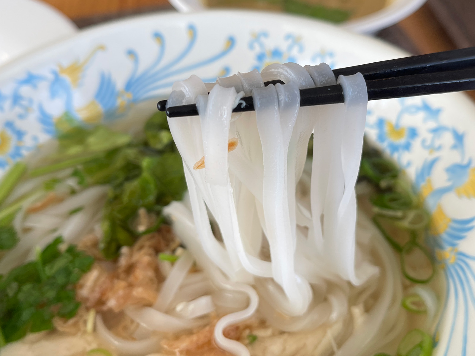 平麺のライスヌードルと、あっさりめだけど旨味のあるスープが合いますね!美味しい!